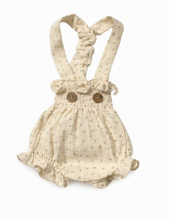 Cubrepañal con tirantes cruzados en tono crema con estampado floral. Fresca, cómoda y perfecta para el verano.