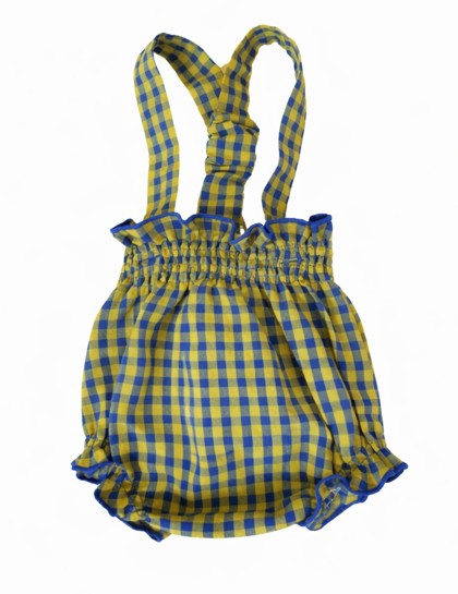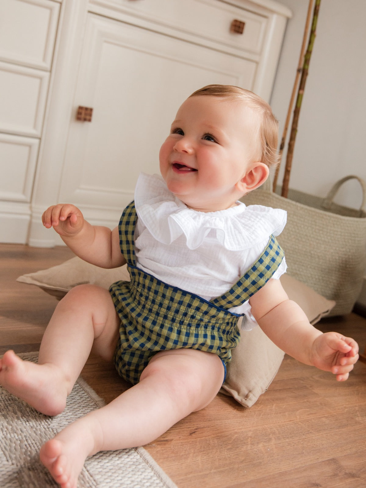Cubrepañal vichy lima y azul con tirantes cruzados, volantes y fruncido suave. Cómodo, fresco y con un aire alegre.