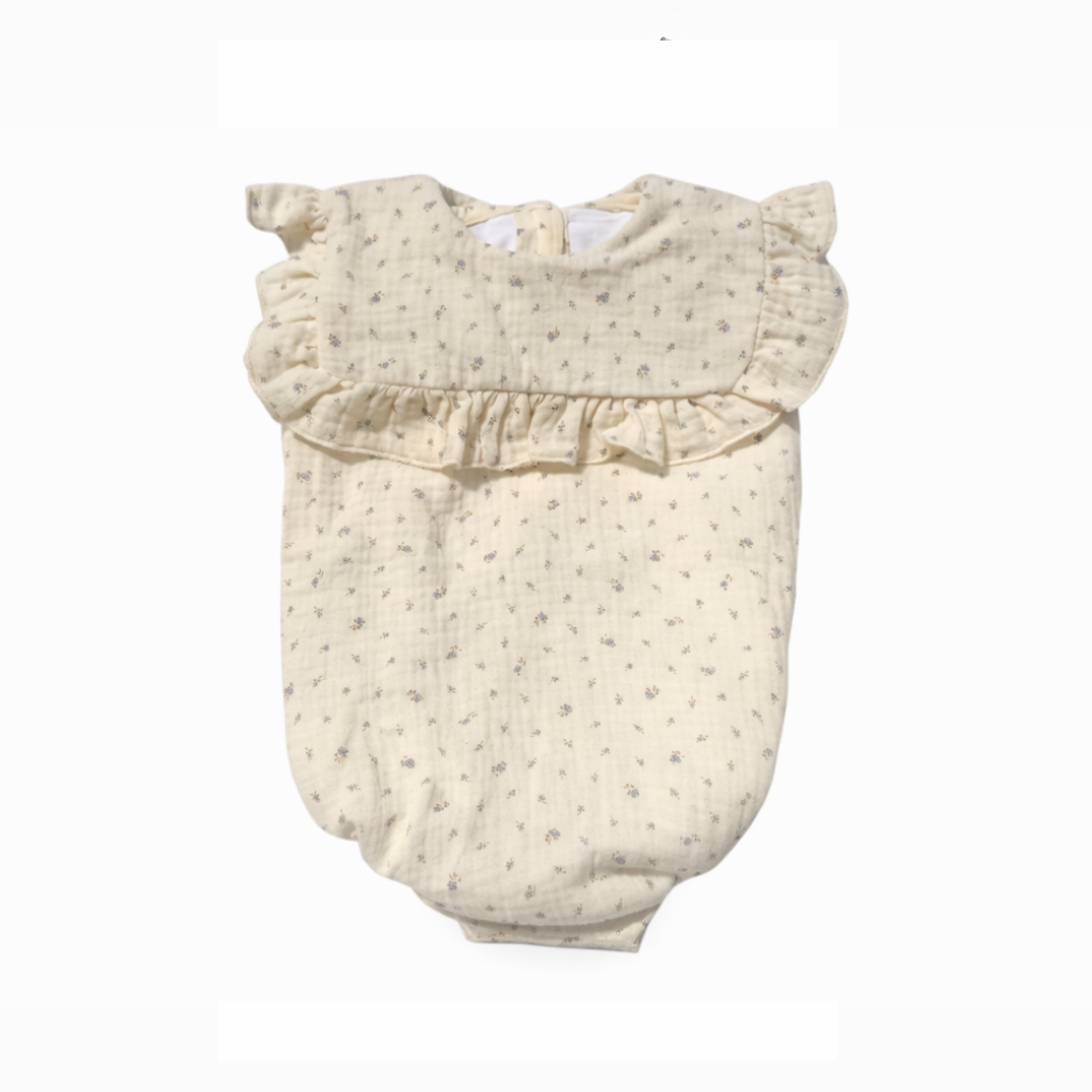 Pelele crema con cuello volante y estampado floral. Suave, dulce y perfecto para los primeros meses.