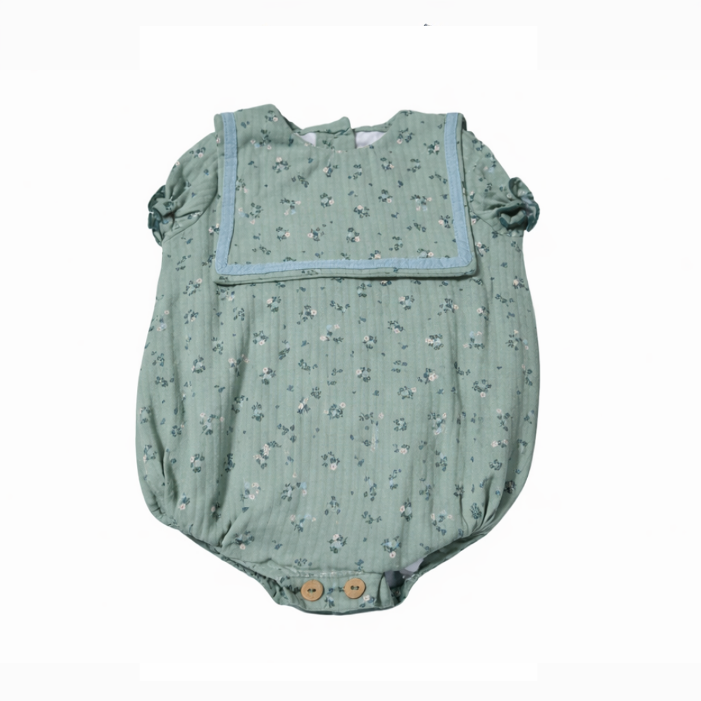 Pelele verde con estampado floral y cuello marinero con ribete celeste. Un diseño cómodo y encantador para los más pequeños.