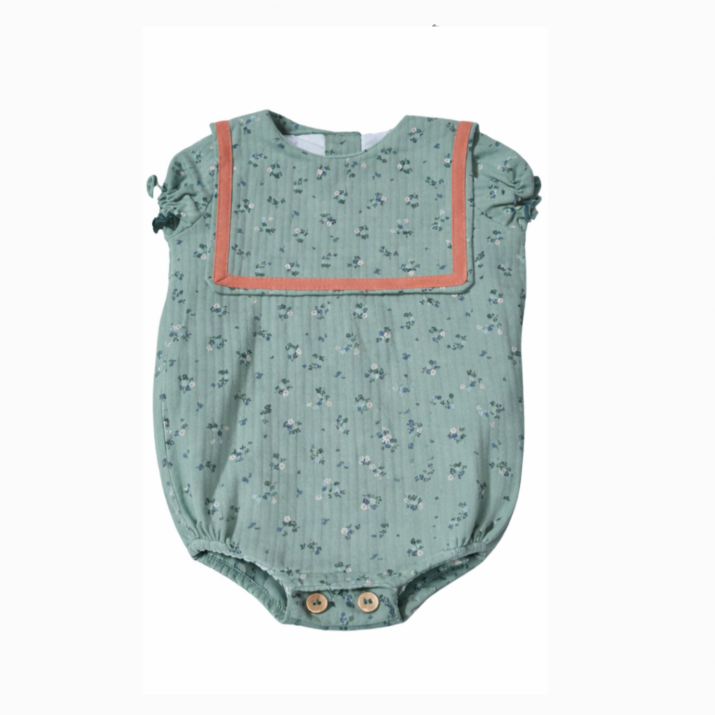 Pelele verde con estampado floral y cuello marinero con ribete teja. Un diseño cómodo y encantador para los más pequeños.