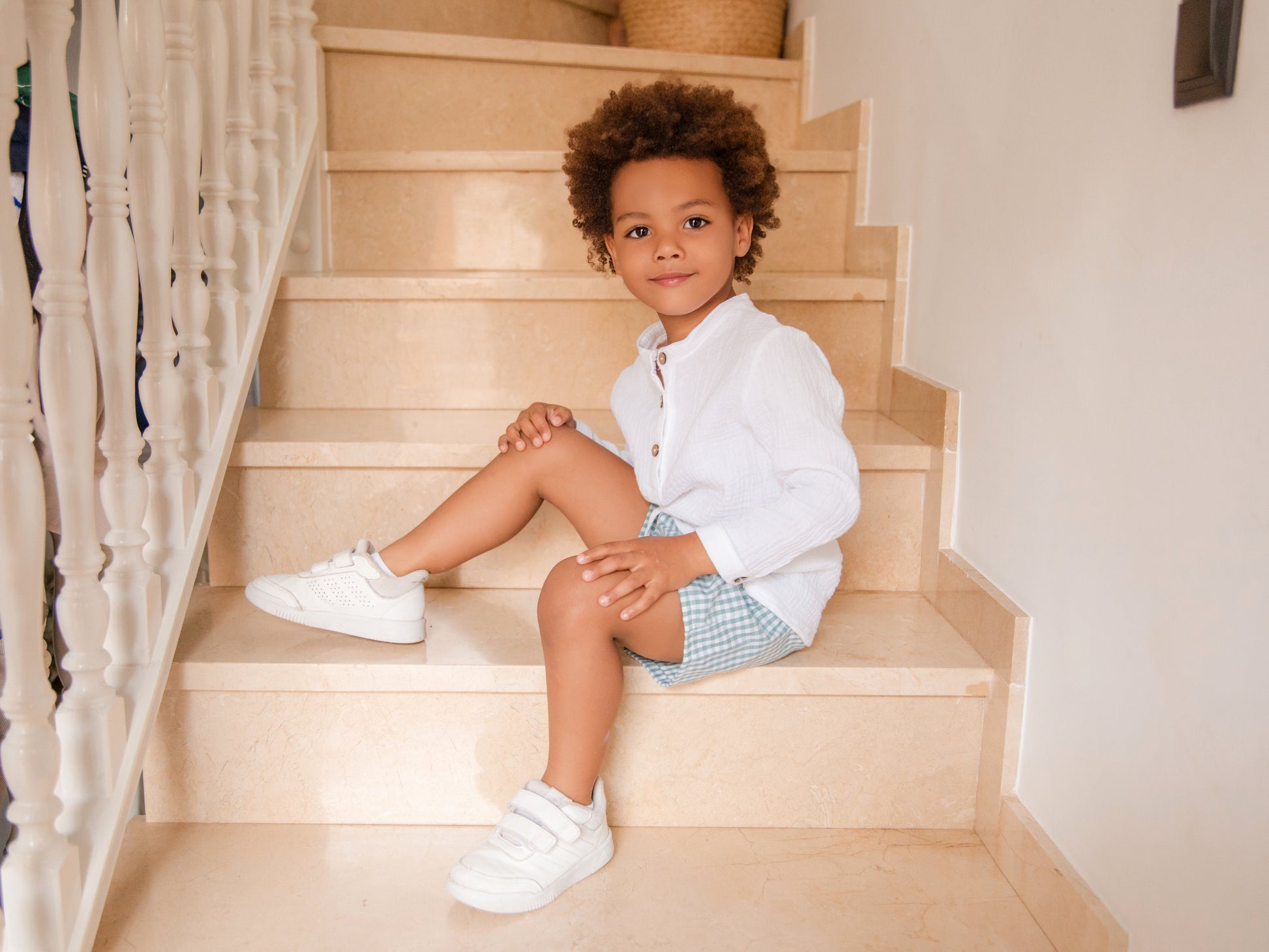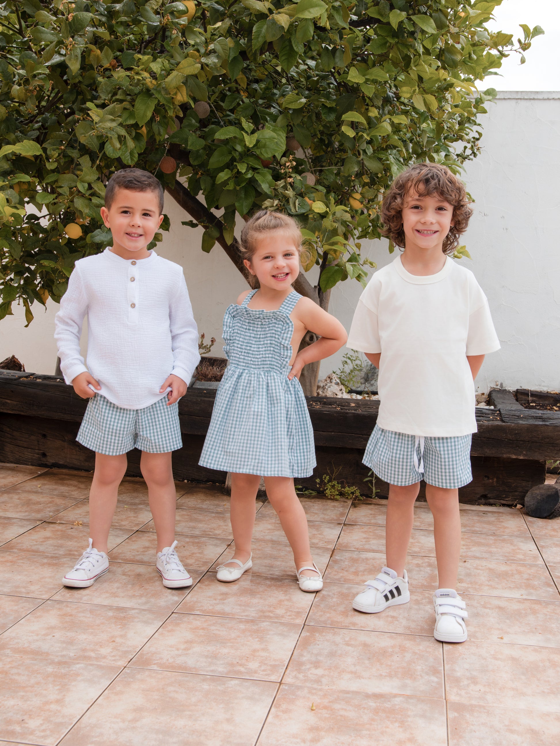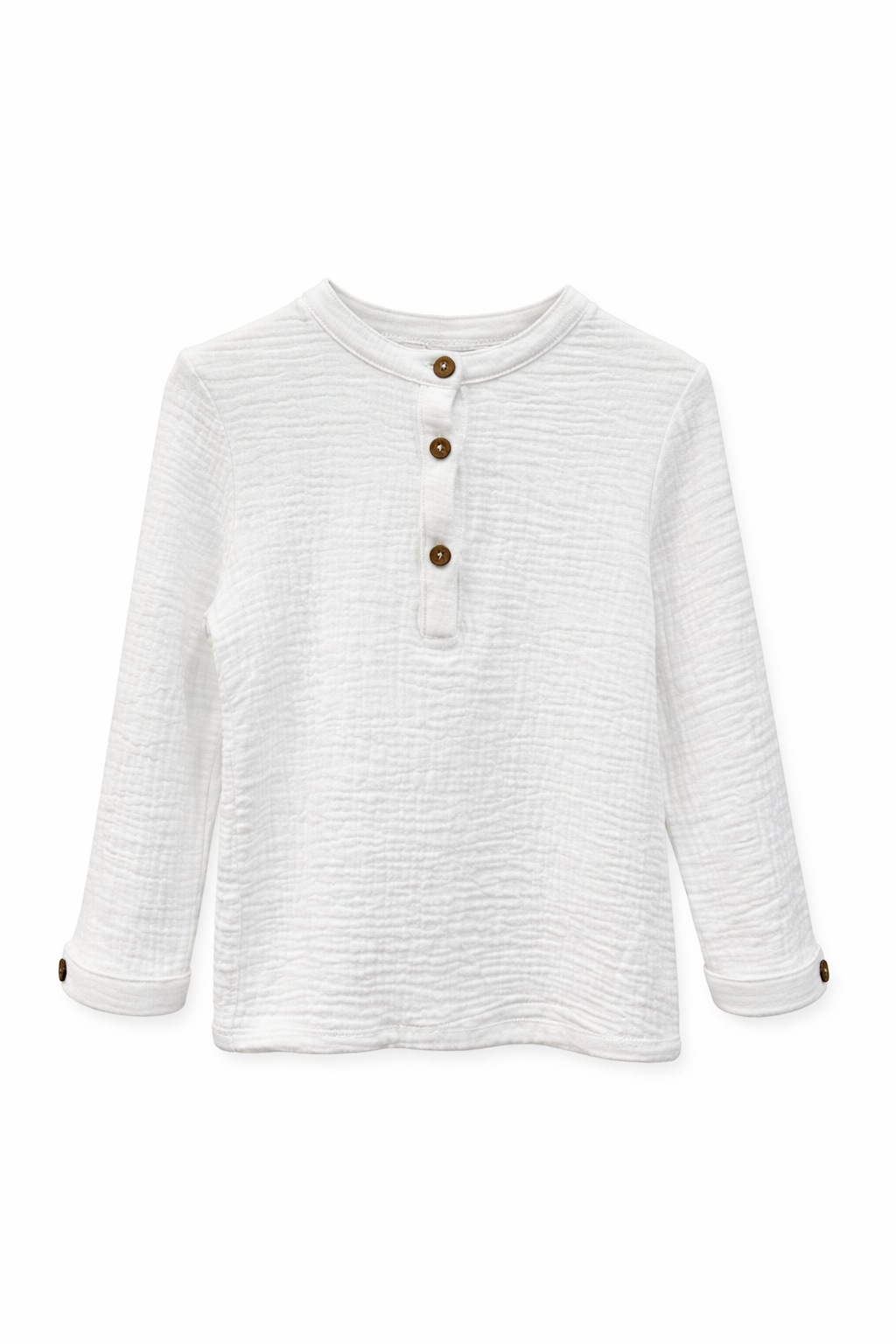 Camiseta blanca de muselina con cuello redondo y botones frontales. Un esencial suave y cómodo para el día a día.