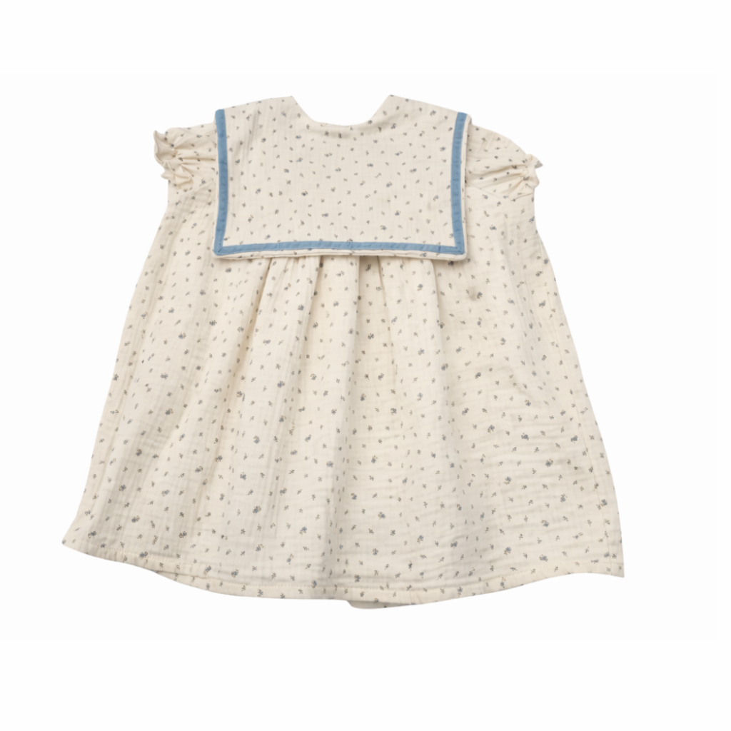 Vestido crema con estampado floral y cuello marinero con ribete azul. Un diseño delicado y lleno de encanto.